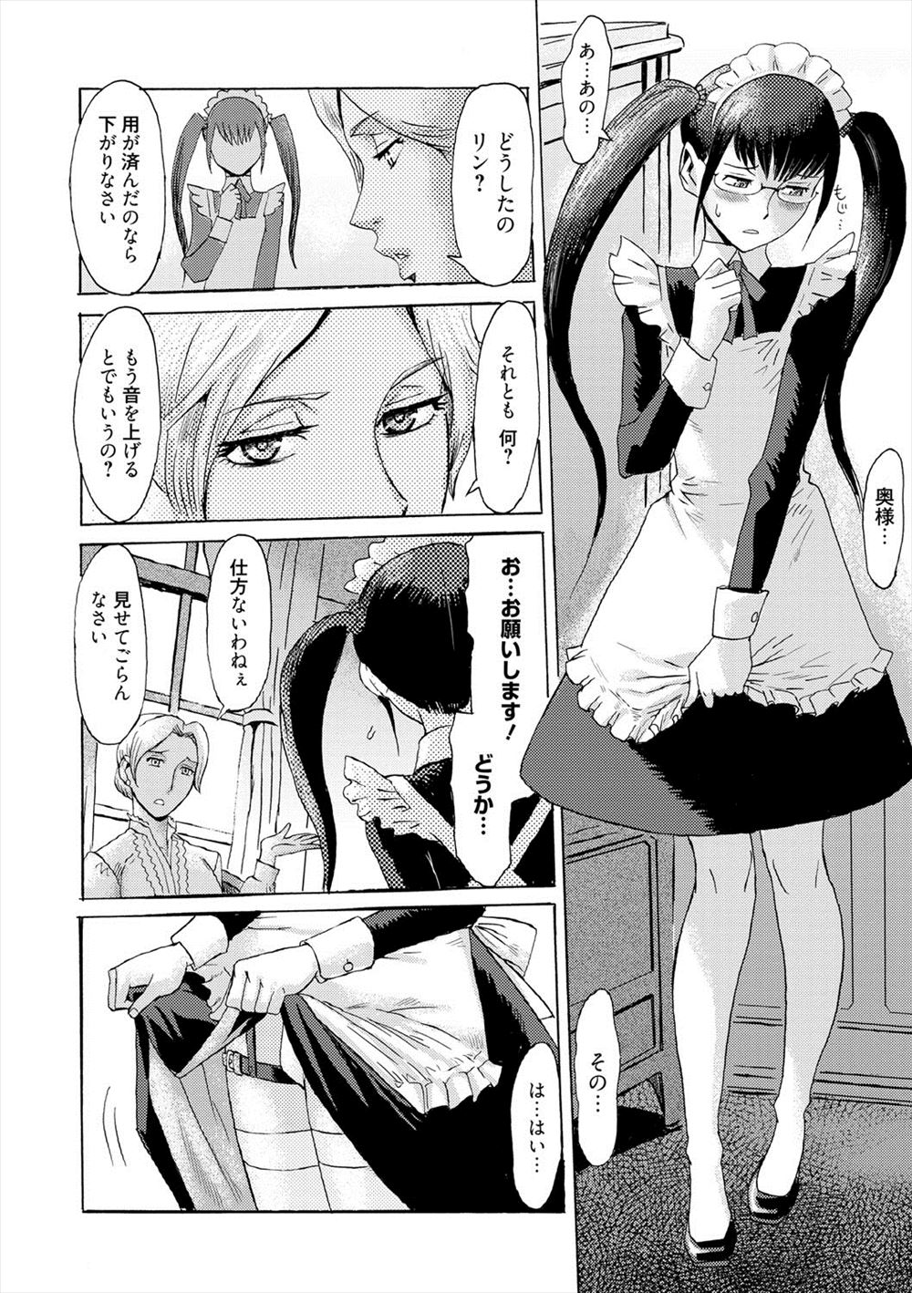 【エロ漫画】奥様の下着を身に着けてオナニーしていた変態使用人が、奥様にメイドコスプレさせられ貞操帯をつけられて…