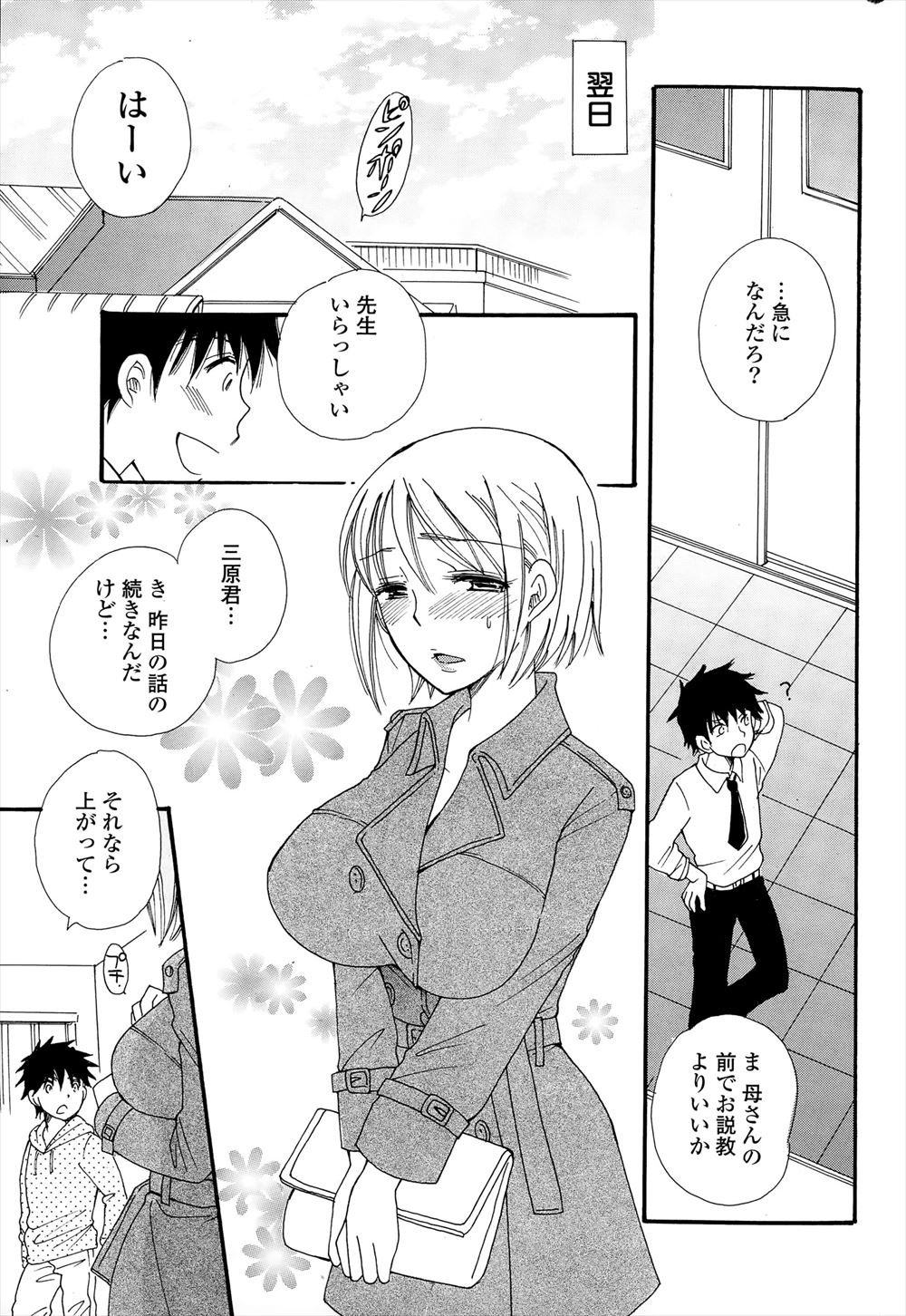 【エロ漫画】持ち物検査で生徒から没収したAVが昔自分が出ていた作品で、口止め代わりに筆おろしする美人巨乳教師!