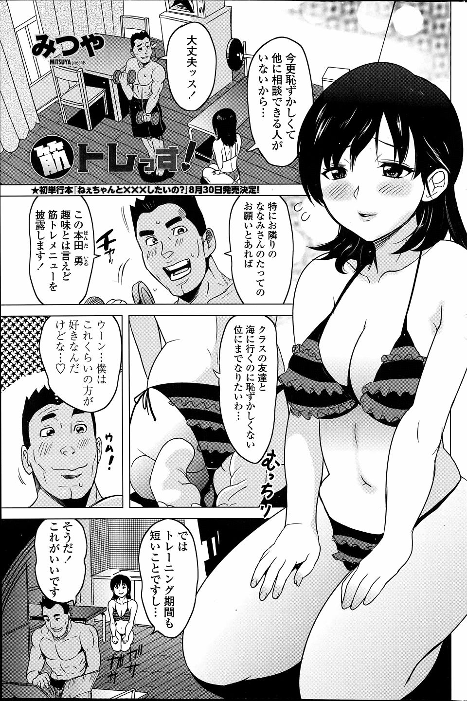 【エロ漫画】きれいな隣人に友達と海に行くまでに身体を絞りたいと相談されて二人きりで筋トレレッスン!のはずが、水…