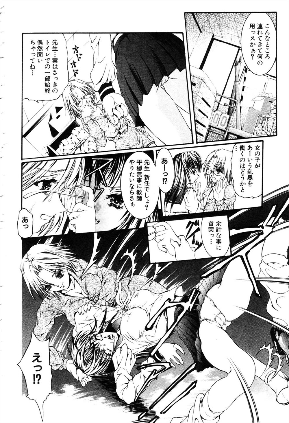 【エロ漫画】メガネをはずすと性格が豹変する新米教師にいじめっこJKがおしおきされ、いじめられっこ男子に中出しレ…